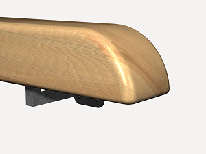 Main courante droite en bois de pin, de 65x70 mm de section, avec vernissage en atelier, avec vernis de polyuréthane, finition brillante, avec supports métalliques pour fixation au parement. |