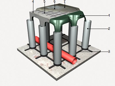 Coffrage perdu avec pièces en polypropylène recyclé, de 58x58x15 cm, à disposer sur des tubes en PVC, sur une matrice de base, pour planchers surélévés grande hauteur sur vide sanitaire. |