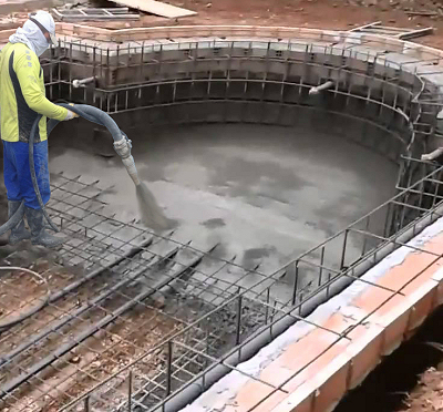 Béton BCN: CPJ-CEM II/A 32,5 - TP - B 30 - 15/25 - E: 2a - BA - P 18-305, projeté par voie mouillée pour la réalisation du parement horizontal du bassin de piscine, de 15 cm d'épaisseur, avec double treillis soudé 100x100 mm et Ø 4,0-4,0 mm, en acier Fe E 500, et armature de renfort d'acier Fe E 500, quantité 4 kg/m³, sans joints de dilatation. Comprend le fil de fer à lier et les séparateurs. |